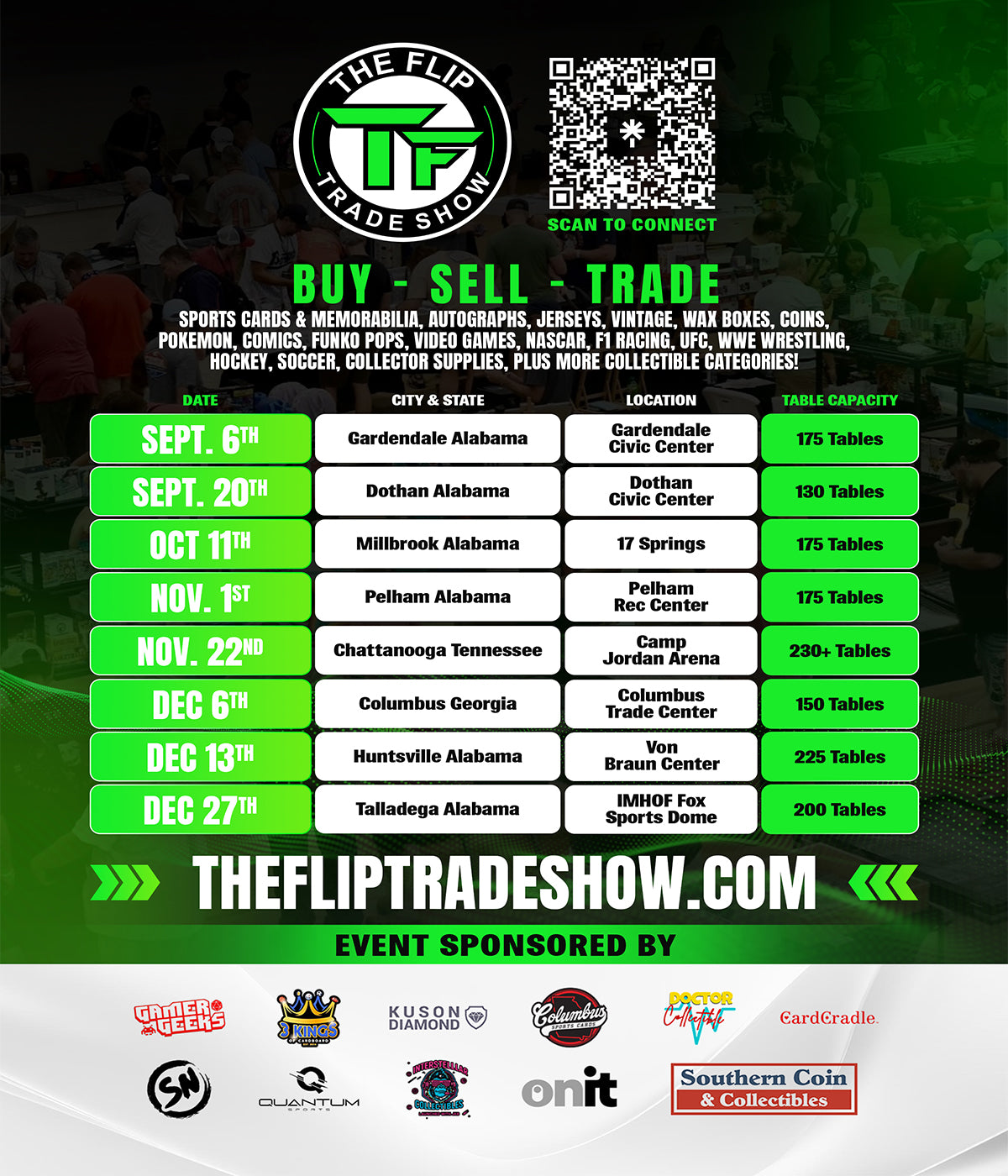 "THE FLIP" is a trade show and marketplace for collectors of Sports Cards & Memorabilia, Autographs, Jerseys, Trading Card Games (TCGS), Pokémon, MtG, Lorcana, Comics, Funko Pops, Currency & Coins, Video Games, Anime, NASCAR, UFC, F1, Wrestling, Hockey, Soccer and many more collectible categories! The selection of items will vary in each category.